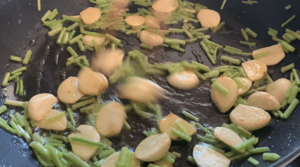 2. 달궈진 팬에 올리브 오일, 마늘, 참나물 줄기를 넣어 볶는다.