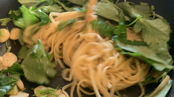 사실 참나물은 잎만 사용해도 좋다. 하지만 참나물 줄기 특유의 아삭한 식감을 파스타에 더하고 싶어서 급하게 줄기도 추가해서 넣어보았다. 넣어서 조리해 본 결과 지금 넣어도 좋지만 마지막 단계인 참나물 잎을 넣을 때 함께 넣어주는 것도 좋겠다. 줄기를 조금이라도 오래 볶으면 자칫 식감이 질겨질 수가 있다.