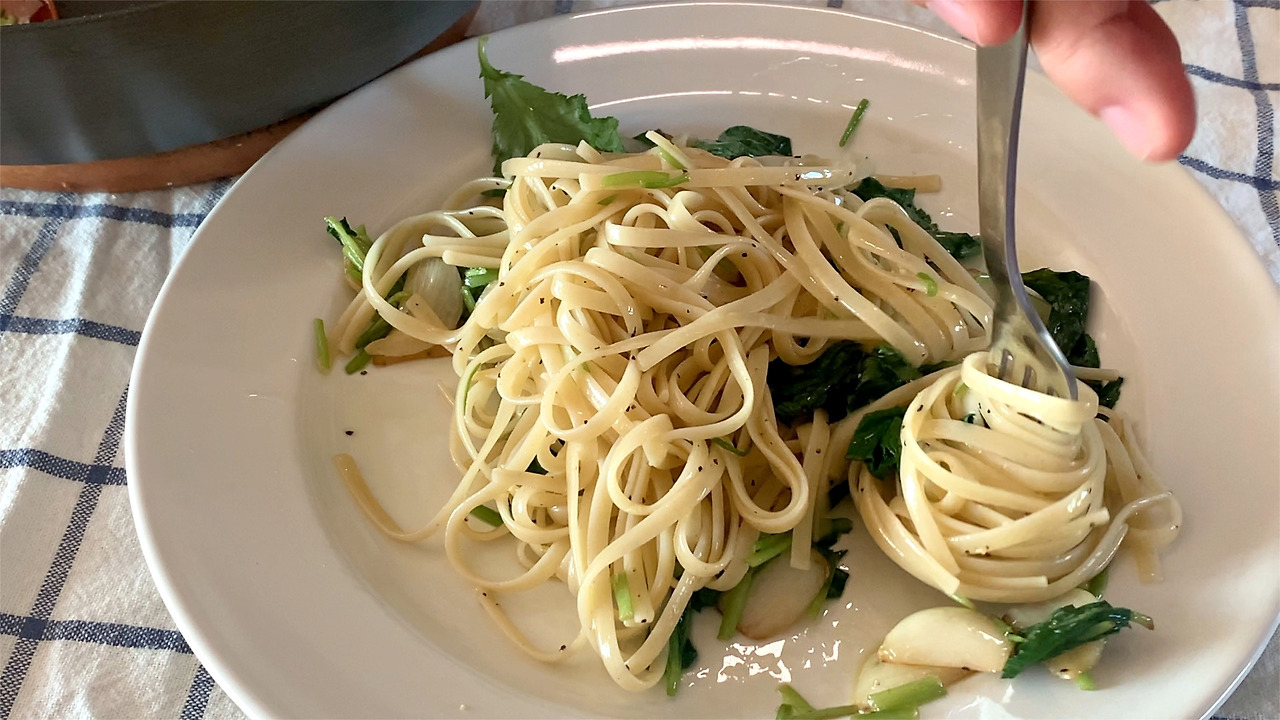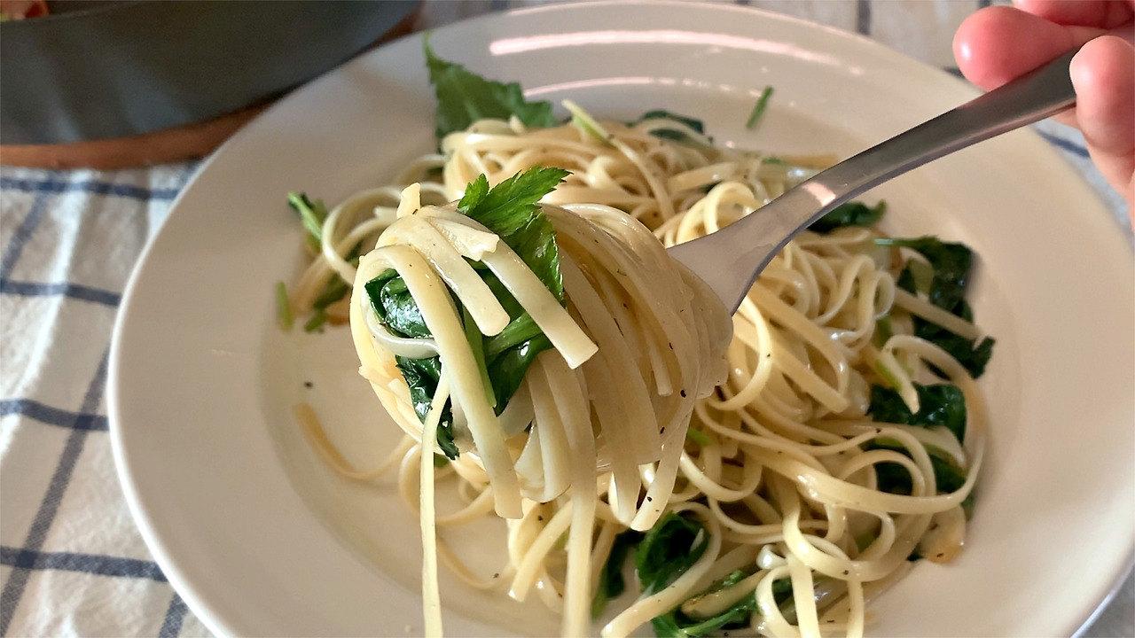 그릇에 파스타를 담고 마지막에 생 참나물 잎을 얹어준다. 이 단계에서 올린 참나물은 비주얼을 위해서이기도 하지만 마지막 단계에서 잃은 참나물의 향을 채우기 위해 얹은 것이다. 아무리 불을 끈 상태로 섞어주었다고 해도 프라이팬의 잔열이 있기 때문에 참나물의 향과 숨이 죽기 마련이다. 그렇기 때문에 마지막으로 향을 살려주는 이 과정이 중요하다. 개인적으로는 참나물을 생으로 잔뜩 얹어먹고 싶을 정도로 마지막에 올린 참나물의 향이 매우 좋았다. 참나물을 생으로 먹는 것에 거부감이 없다면 프라이팬 위에서 참나물을 섞기보다는 파스타만 프라이팬에서 조리하고 참나물은 그릇 위에서 올려 섞어 먹는 것을 더욱 추천한다.