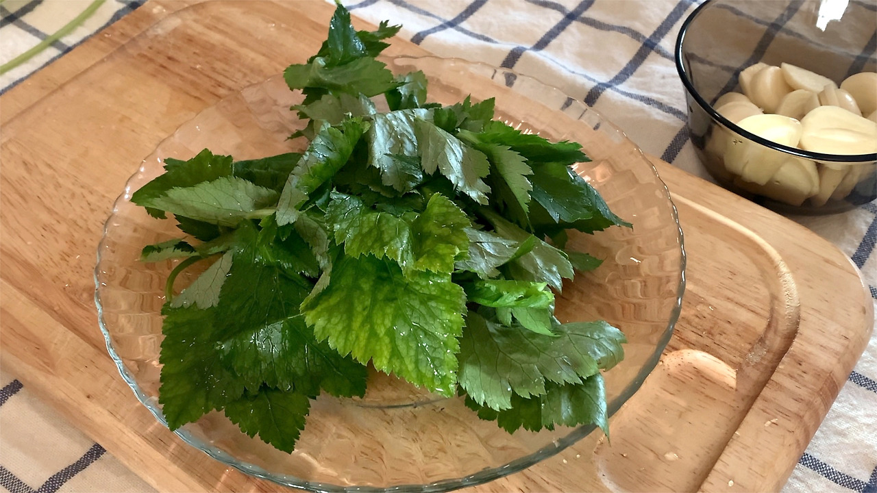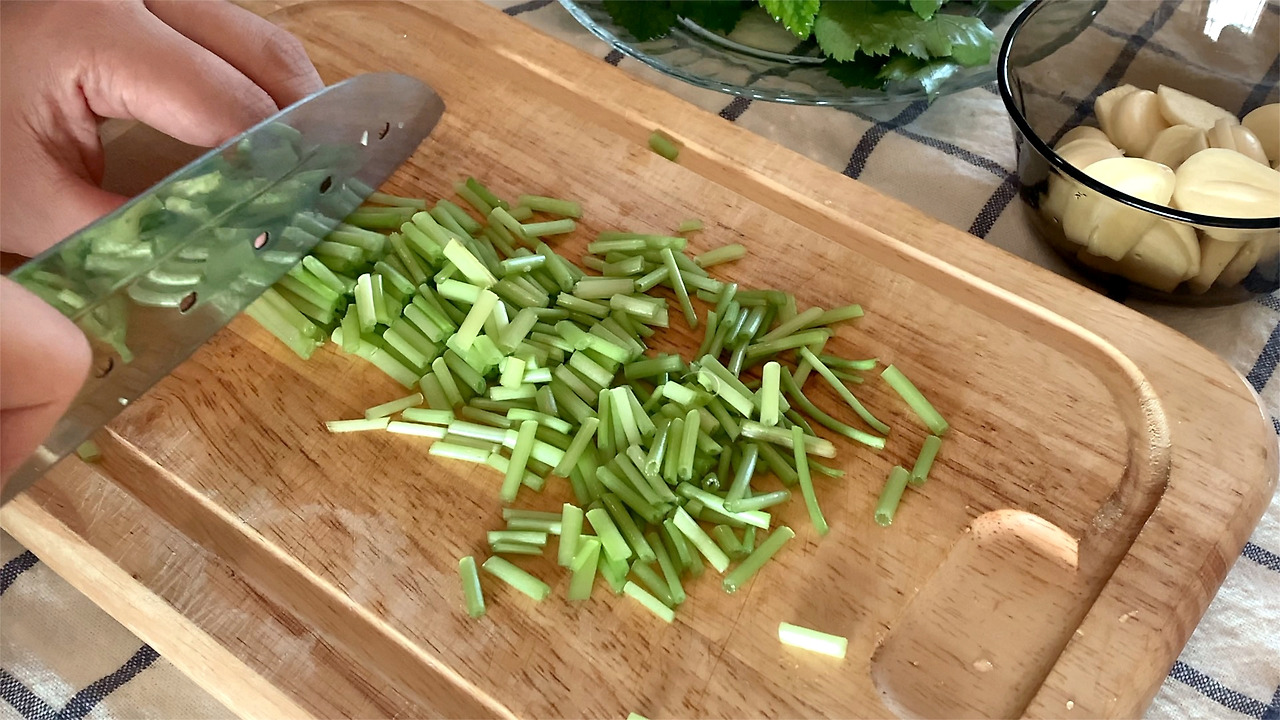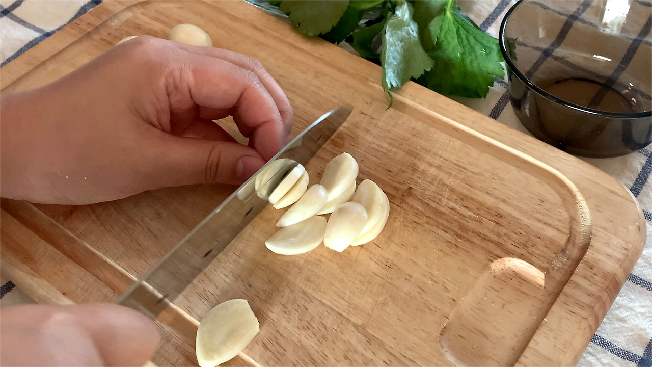1. 마늘은 편 썰고 참나물은 잎만 떼서 준비한다. 참나물 줄기는 굵게 다져준다.