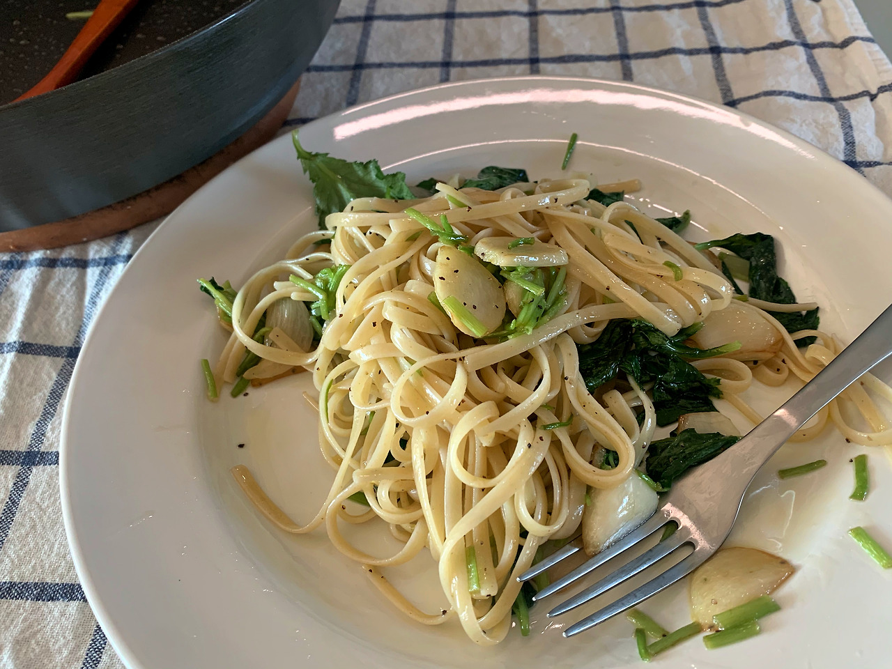 참나물 50g, 올리브 오일 4큰술, 마늘 8쪽, 소금 약간, 후추 약간, 링귀니 1인분