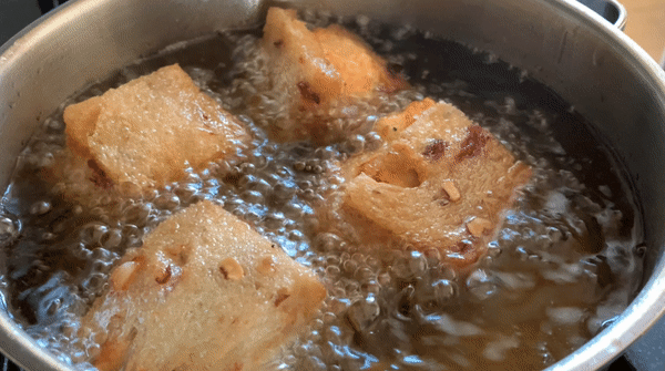 4. 기름의 온도가 60도까지 올라갔을 때 멘보샤를 넣어 튀겨준다.