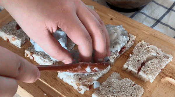 이 단계 또한 개인의 취향대로 넣어주면 된다. 얇고 바삭한 멘보샤가 좋다면 새우 반죽을 얇게, 두툼하고 씹는 맛이 좋은 멘보샤가 좋다면 새우 반죽을 두툼하게 넣어주자. 난 개인적으로 새우의 맛을 풍부하게 느끼고 싶었기에 새우 반죽을 두툼하게 넣어 준비했다.