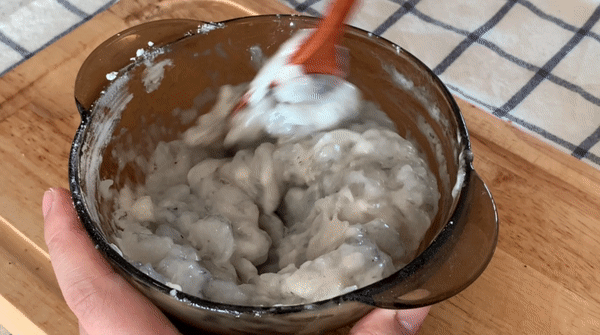 2. 해동한 새우의 물기를 제거하고 잘게 다진다. 다진 새우에 소금, 후추, 전분가루를 넣어 반죽한다.