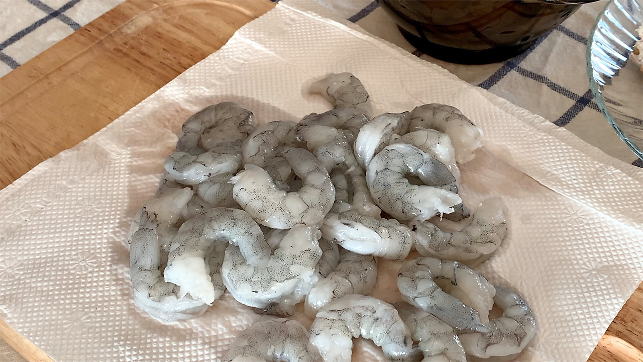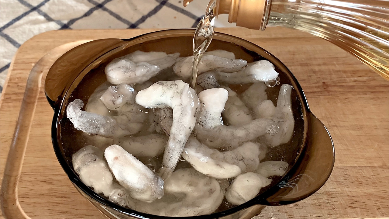1. 냉동 새우를 맛술을 섞은 물에 넣어 10분 동안 해동한다.