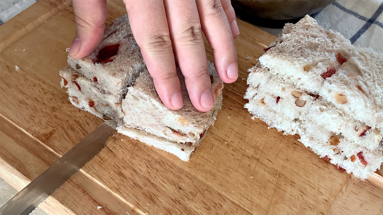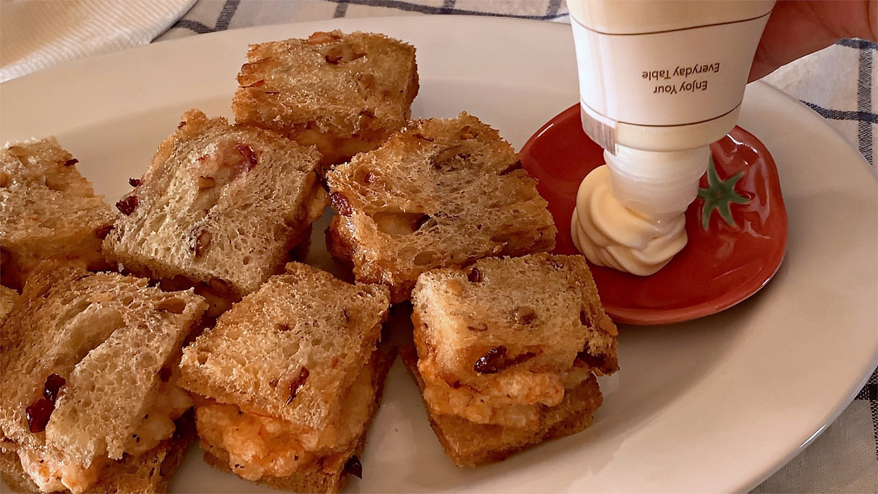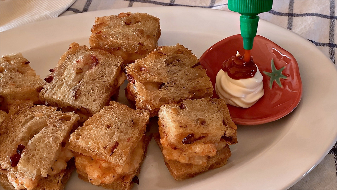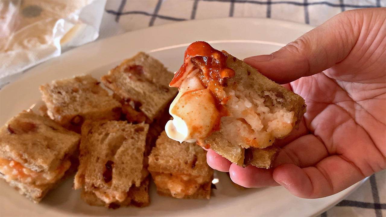 3. 4등분한 식빵 사이에 새우 반죽을 넣어준다.