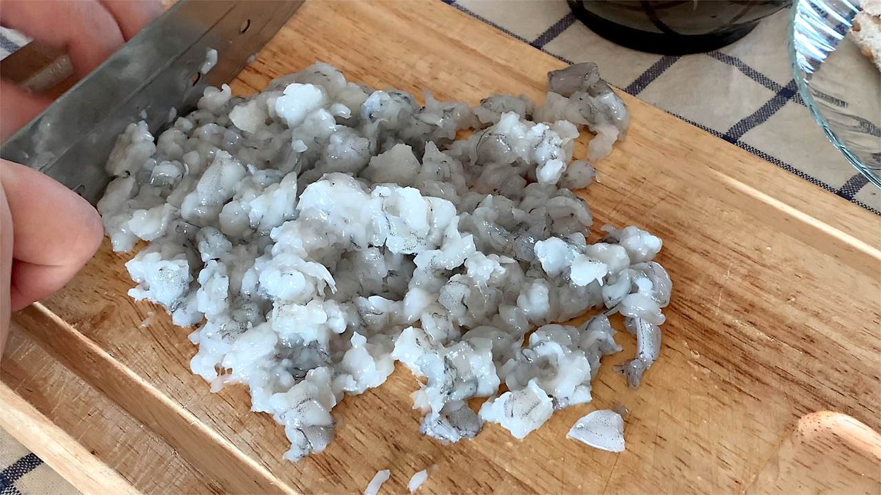 이 과정에서는 각자의 취향에 따라 새우를 다져주면 된다. 난 새우의 식감을 조금 더 느끼고 싶었기에 알갱이가 조금 살아있을 정도로만 다져주었다. 만약 곱게 다지고 싶다면 칼등으로 새우를 여러 번 쳐서 으깬 뒤 칼로 잘게 썰어주면 된다.
