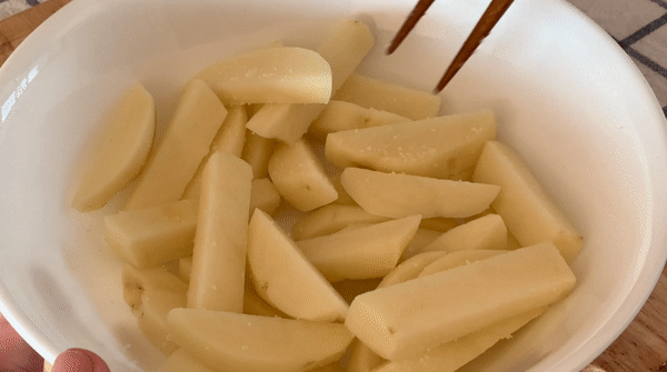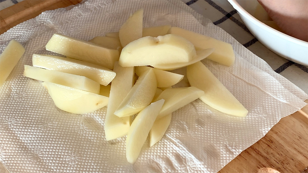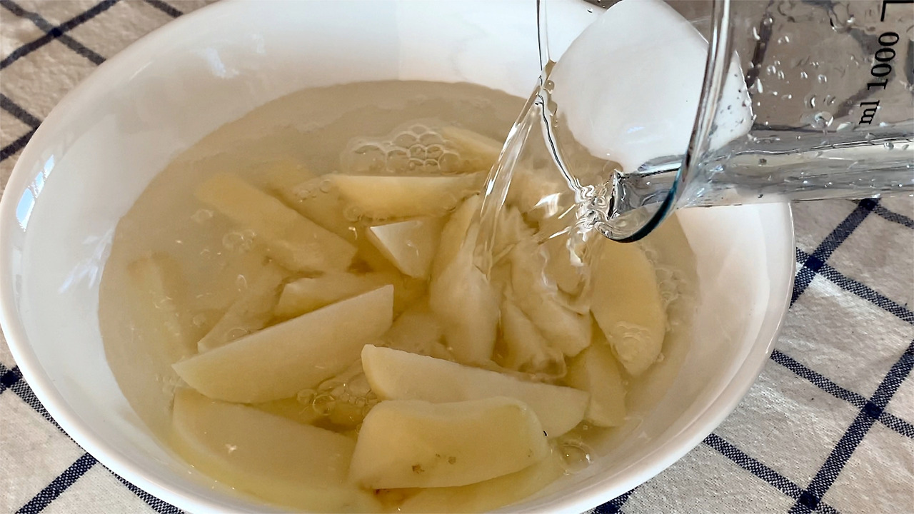 감자의 전분기를 빼주는 이유는 더욱 바삭한 프렌치프라이를 만들기 위해서다. 전분은 불과 만나면 쫀득해지는 특성이 있기 때문에 튀김을 할 때에는 자칫 방해물이 되어버릴 수가 있다. 그러니 물에 담가 전분기를 적당히 빼준 후 물기를 제거해서 준비하자.