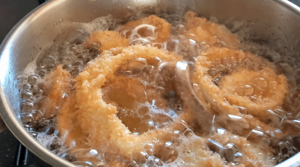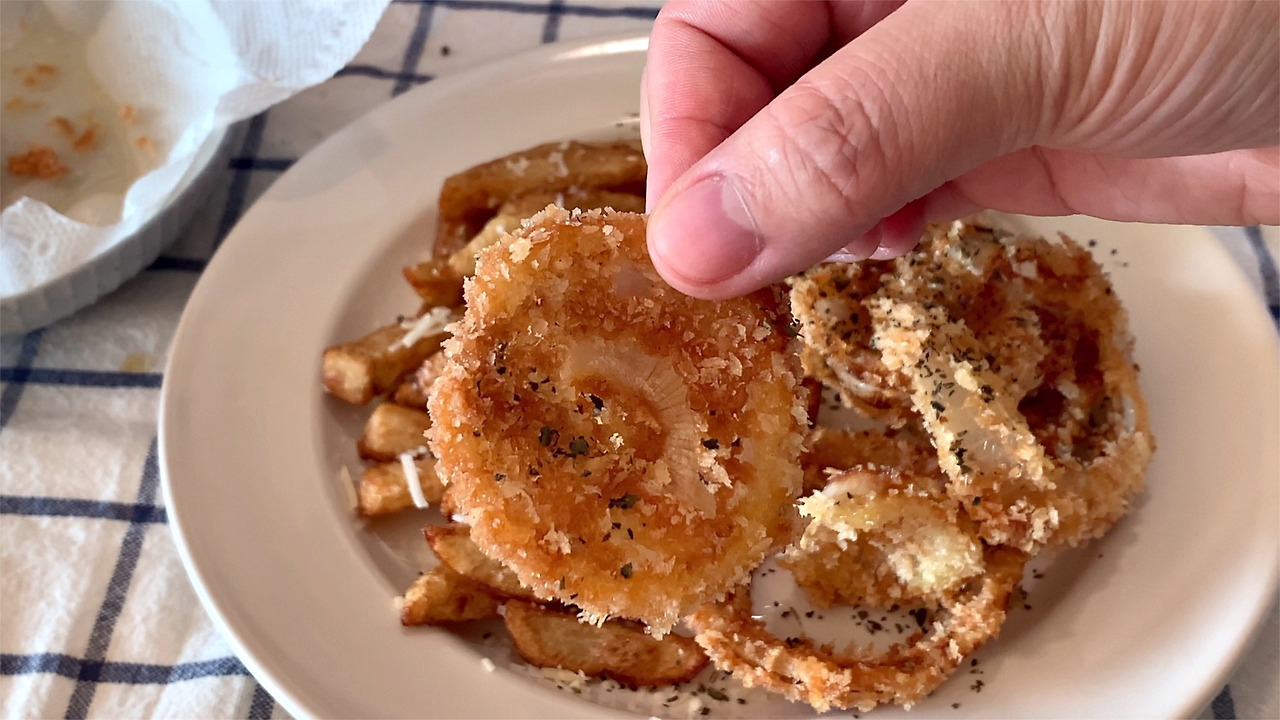 이 과정에서 제일 중요한 것은 기름의 온도와 튀기는 횟수다. 감자는 한 번만 튀기면 프렌치프라이 특유의 바삭함이 살지 않기 때문에 두 번 튀겨서 색과 식감을 살려주는 것을 추천한다. 하지만 양파는 다르다. 양파는 불 위에서 오랜 시간을 보내면 쉽게 물러지기 때문에 적당히 강한 170도에서 튀김옷이 노릇해질 정도로만 살짝 튀겨주는 것이 식감과 맛을 살리는 길이다.
