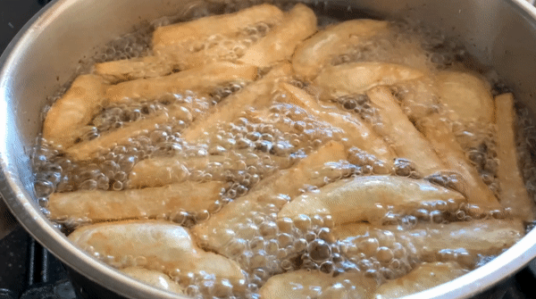3. 기름을 약 170도가량으로 달군 후에 감자, 양파를 넣어 노릇한 색감이 나올 때까지 튀겨준다.