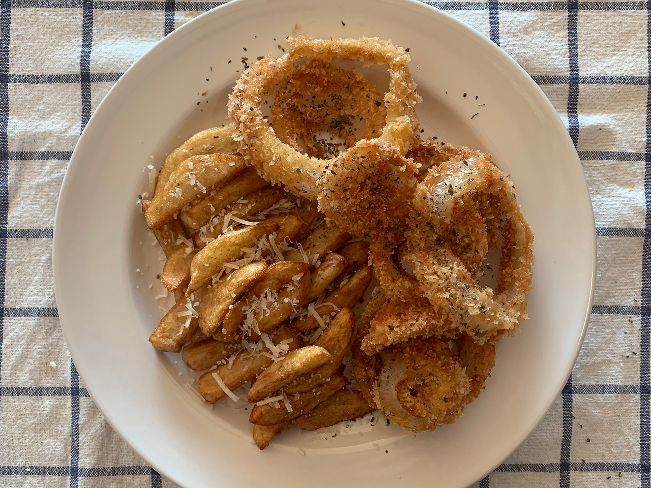 감자튀김과 어니언링을 그릇에 담고 감자튀김에는 파마산 치즈, 어니언링에는 말린 바질을 뿌려준다. 난 애초에 말린 바질을 사용할 생각은 없었다. 대부분의 사람들이 그렇듯 당연히 말린 파슬리를 뿌려 색감을 더해주려고 했다. 하지만 세상 모든 일이 모두 내 뜻대로 되지는 않지. 요리 재료를 사러 마트에 갔지만 그날따라 말린 파슬리가 품절이라 구하지 못했다. 그래서 대체품으로 사용한 것이 말린 바질이다. 애초에 색감만 조금 더해주려고 사용한 것이기 때문에 사실 맛은 기대하지 않았다. 그런 바질의 존재감이 이렇게 클 줄이야. 바질 특유의 향긋함이 양파와 어우러지면서 향을 끌어올려주고 기름 특유의 느끼함 또한 잡아주었다. 궁여지책으로 사용한 식재료가 이 요리의 팁이 되는 순간이었다.