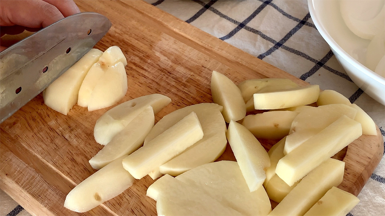 1. 감자, 양파를 손가락 마디 두께로 썰어준다. 감자는 물에 20분 정도 담가 전분기를 빼주고 물기를 제거한다.