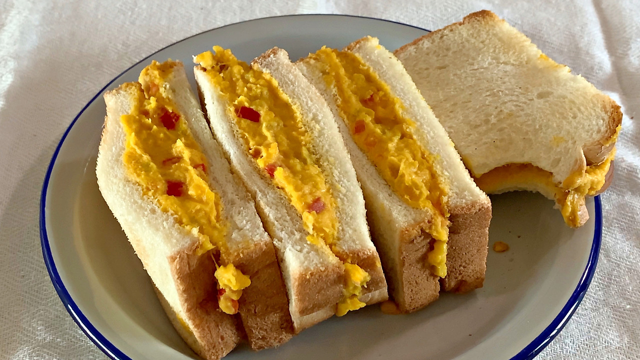 단호박 샌드위치 또한 훌륭한 요리이지만 다른 요리와 비교해보면 가볍게 느껴지는 간식 같은 요리다. 그래서 그런 느낌을 더욱 살리기 위해서 법랑 접시를 사용했다. 법랑은 깨질 걱정이 없는 그릇이기 때문에 여기저기 막 가져다가 쓸 정도로 편하고 손이 많이 간다. 그런 가벼운 매력이 단호박 샌드위치와 잘 어울린다. 그리고 접시 테투리에 있는 파란 색감의 선이 단호박의 노란색과 대비돼서 대충 올려만 놔도 플레이팅이 풍성해 보인다. 예전에 만든 단호박 수프에서도 나왔듯이 플레이팅에 어려움을 겪는다면 그릇과 음식의 색감 대비를 이용해서 플레이팅을 하는 것도 좋다.