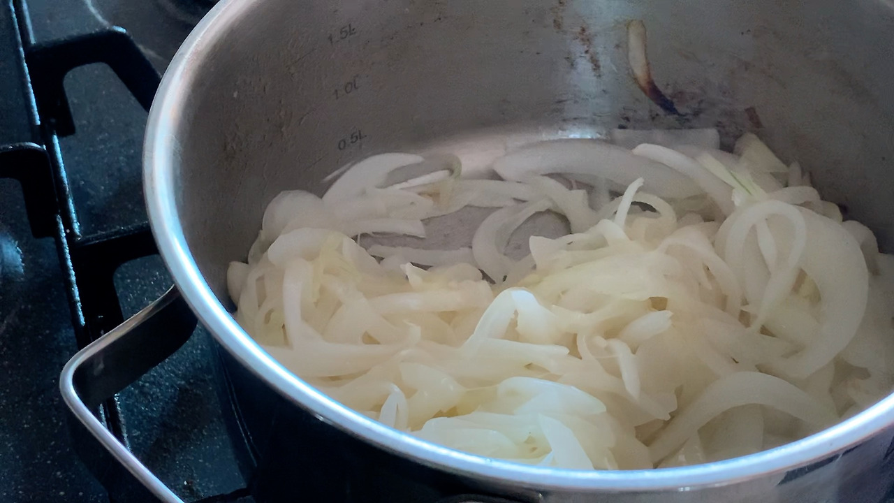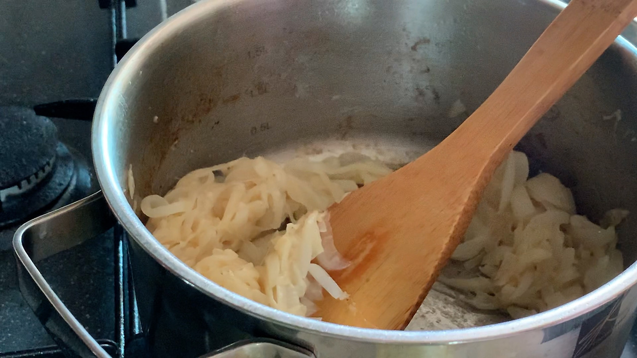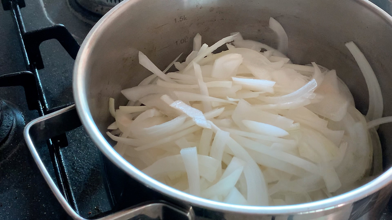 2. 냄비에 버터와 식용유를 넣어 달궈준 뒤, 채 썬 양파를 넣고 양파가 갈색을 띨 때까지 볶아준다.