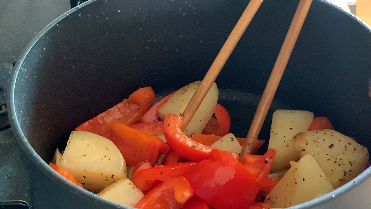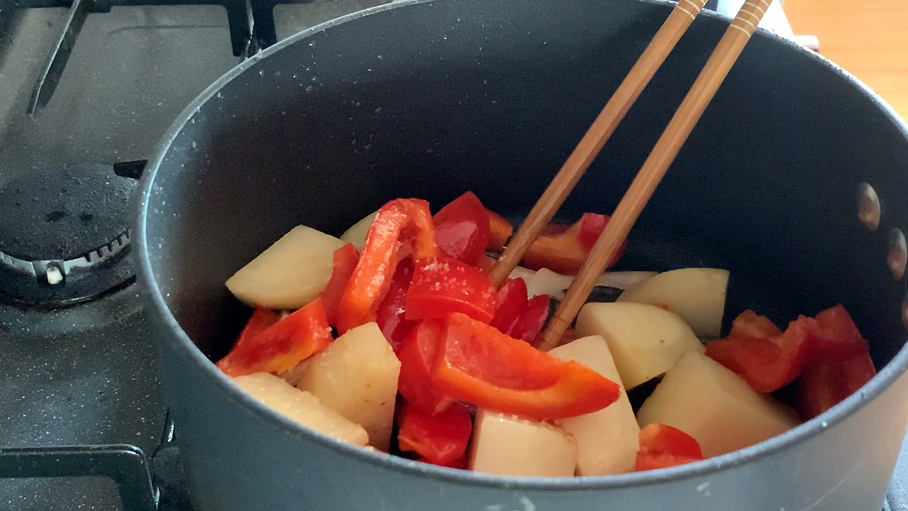 카레의 간 만으로도 충분히 맛있지만, 소금과 후추 간을 하면 재료 속속들이 간이 배어 훨씬 완성도 있는 맛을 낼 수 있다. 하지만 심심하게 먹는 것을 선호한다면 생략해도 좋다. 그리고 이 단계에서 파프리카를 충분히 익혀야지만 파프리카의 향을 물씬 느낄 수 있다.