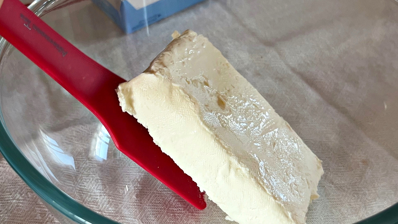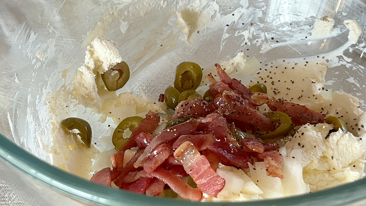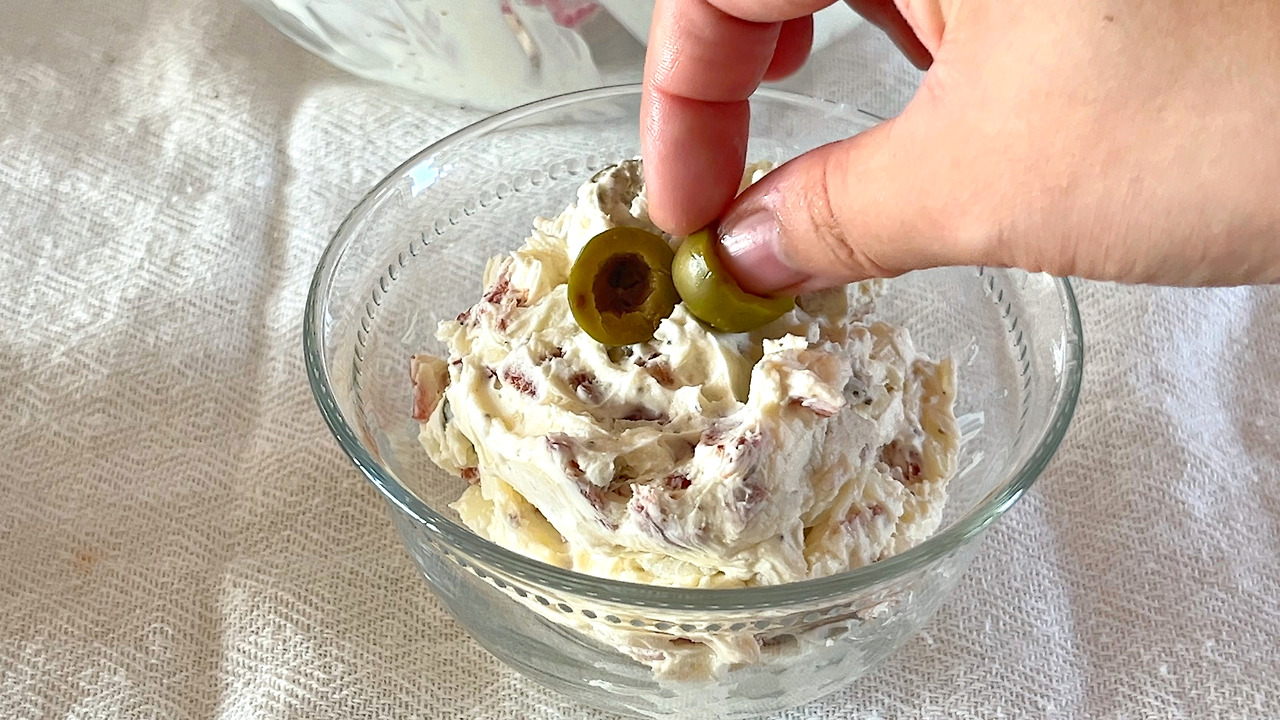 3. 크림치즈(220g)를 보울에 넣어 부드럽게 풀어준 뒤에 크림치즈 110g, 베이컨, 올리브, 양파, 꿀, 후추를 넣어 섞어준다.