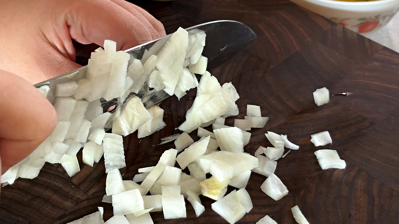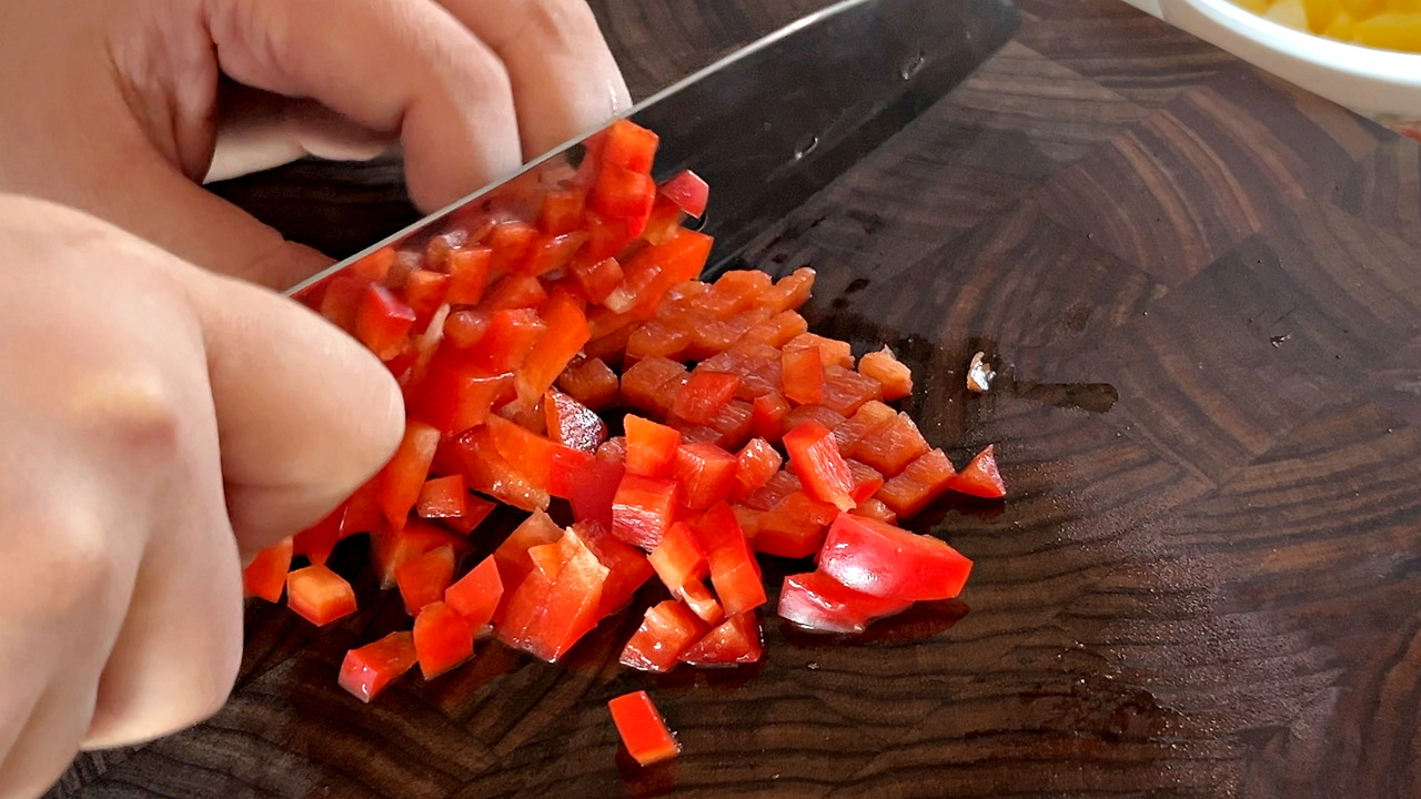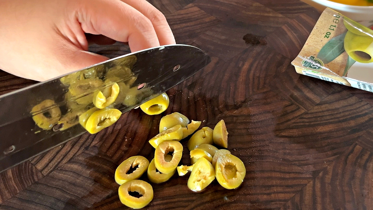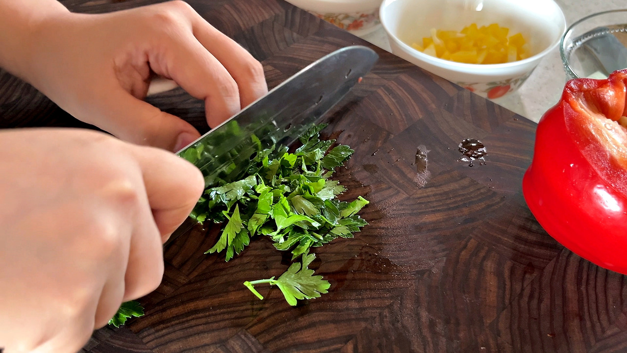 1. 올리브, 양파, 빨강 파프리카, 노랑 파프리카, 파슬리를 굵게 다져준다.