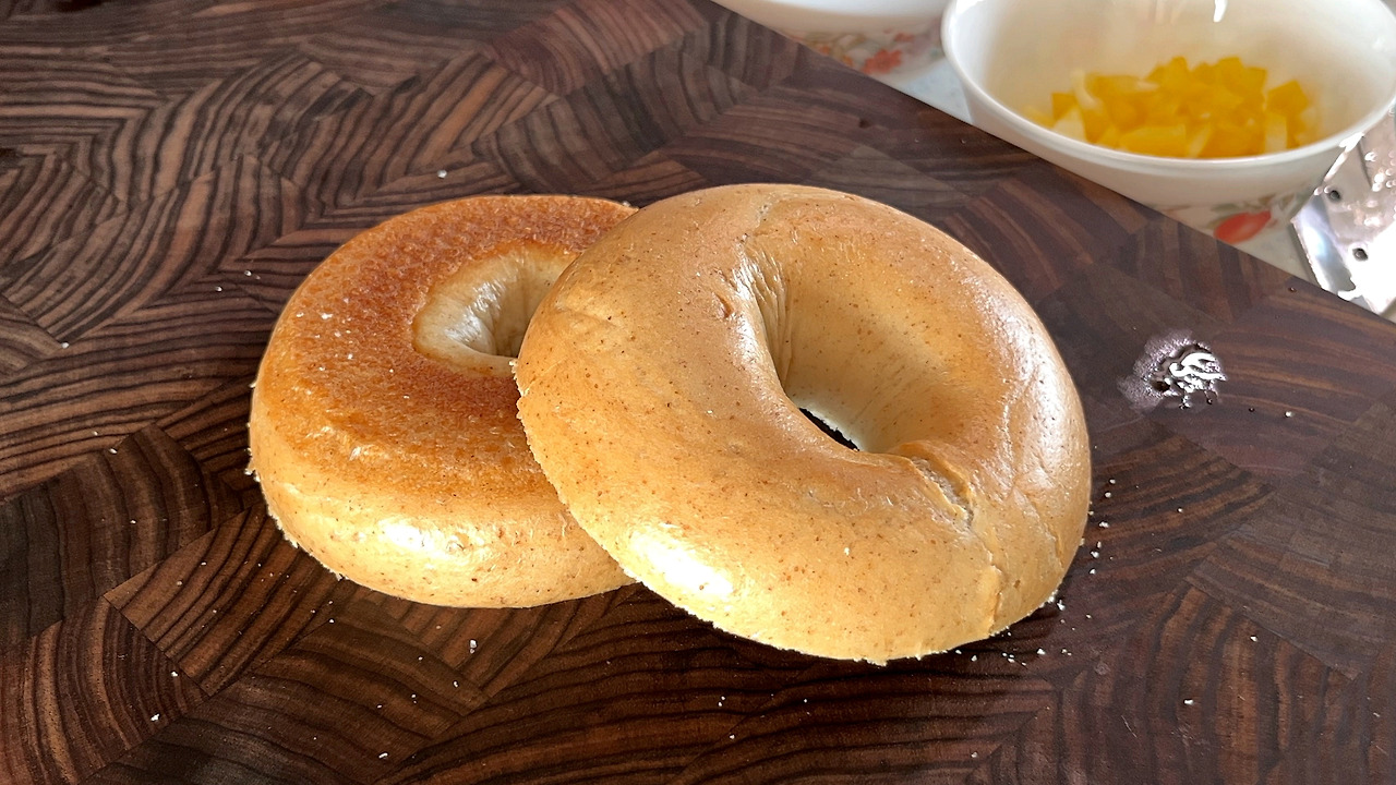 5. 베이글을 반으로 갈라 바삭하게 구워 완성된 크림치즈를 발라 플레이팅 한다.