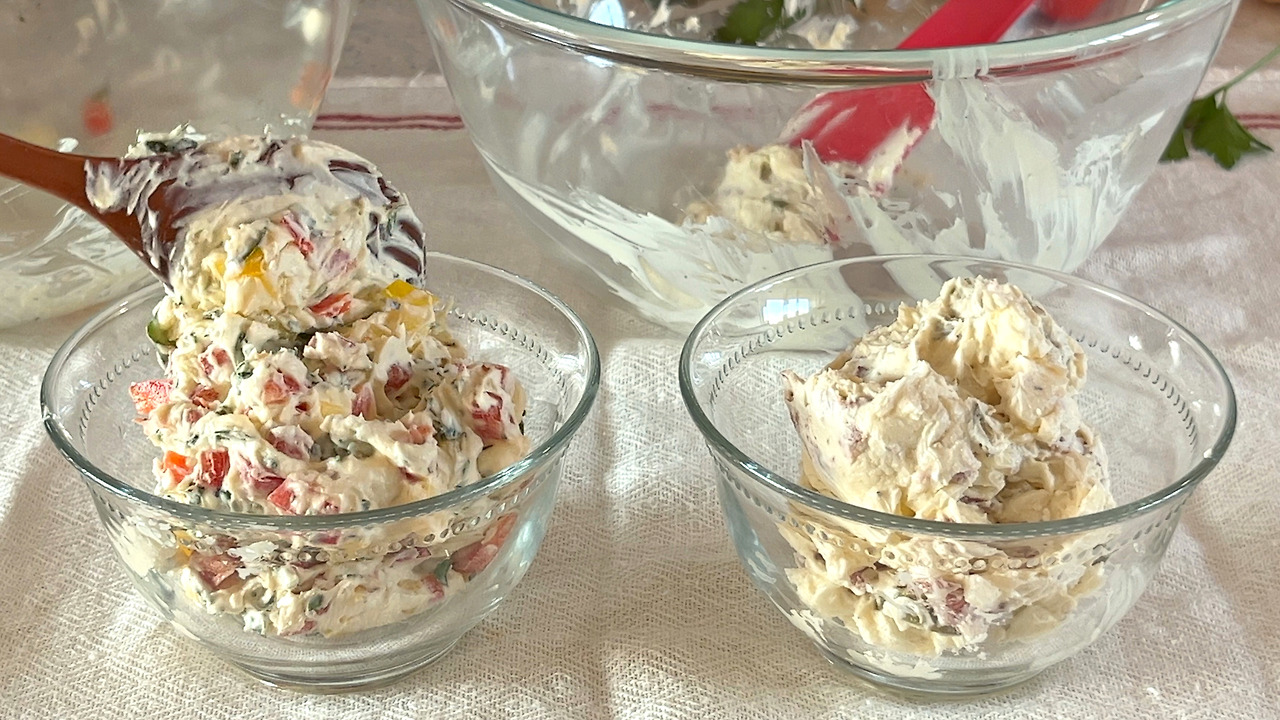 파프리카 크림치즈는 상큼하고 가벼운 그리고 향긋함만 가득한 매력이 있으면 좋겠다 싶어 파프리카와 파슬리만 넣고 만들었다. 그리고 베이컨 크림치즈와 달리 꿀 대신 설탕을 넣어주었다. 베이컨 크림치즈에는 물기가 있는 재료가 없어 부드러움을 더하기 위해 꿀을 넣은 것이고, 파프리카 크림치즈는 파프리카의 수분만으로도 충분한 부드러움을 느낄 수 있어 설탕을 택했다.