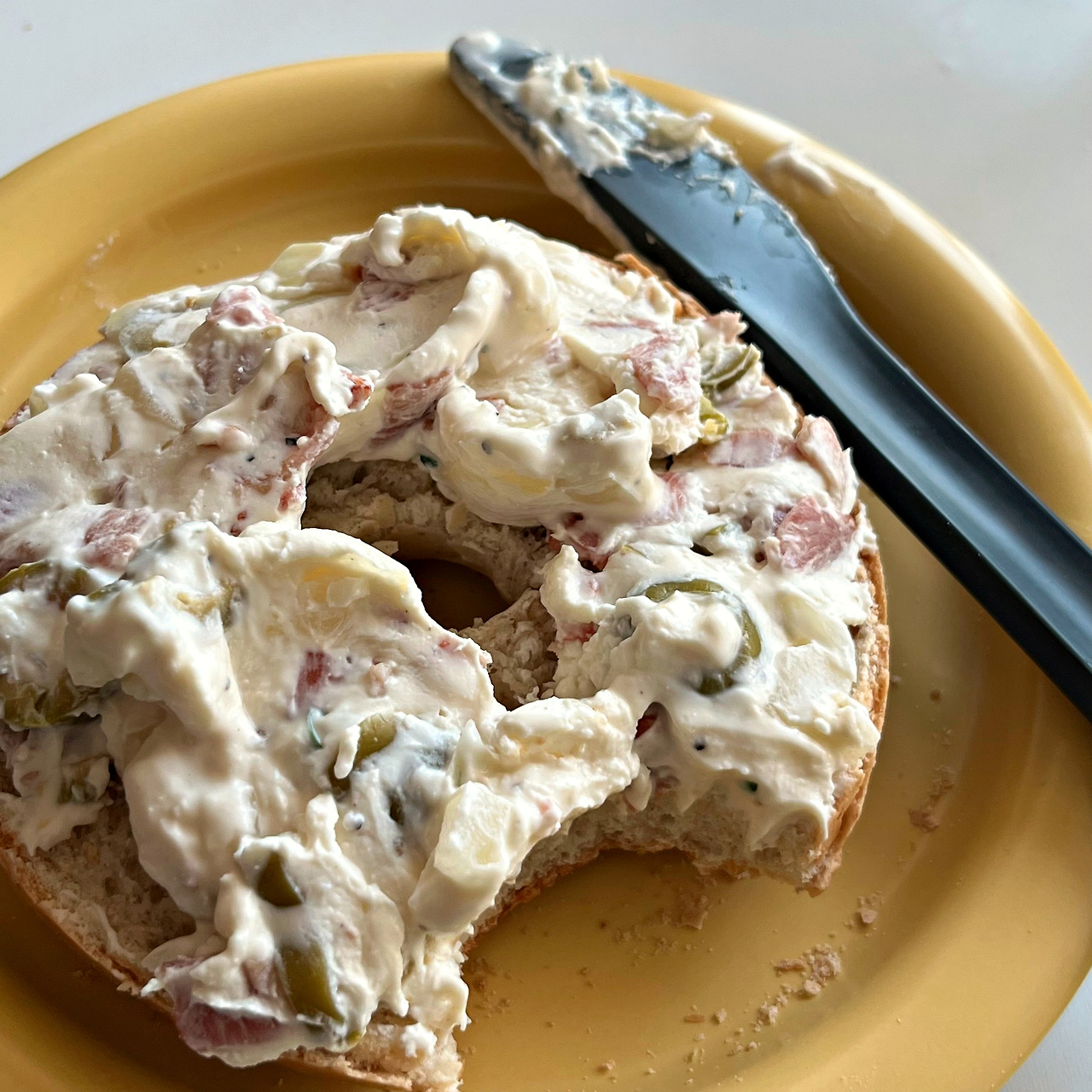이 세상에는 먹는 쪽으로 머리가 좋은 사람들이 참 많다. 평범한 크로와상에 와플을 더해 만든 크로플, 납작한 마카롱에 두툼한 필링을 더해 만든 뚱카롱, 파스타에서만 쓰이던 로제를 떡볶이에 넣어 만든 로제 떡볶이까지. 모두 평범한 것들에 '작은 포인트'를 더해 더욱 맛있고 새로운 음식들을 만들어내고 있다. 오늘 만들 요리 또한 평범했던 크림치즈에 여러 가지 재료를 섞어 만든 특별한 크림치즈다. 사실 크림치즈는 촉촉하게 구운 베이글에 두툼하게 발라먹기만 해도 맛있는 재료다. 하지만 똑똑한 사람들은 여기에 베이컨, 파, 올리브 등을 넣어 새로운 요리를 탄생시켰다. 재료 한두 가지 더 넣는 건데 그렇게 맛이 다를까? 하고 생각하는 분들은 꼭 이 레시피를 따라 해봤으면 한다. 그렇게 생각하고 먹었다가 새로운 맛의 충격을 느낀 사람이 여기 있기 때문이다.