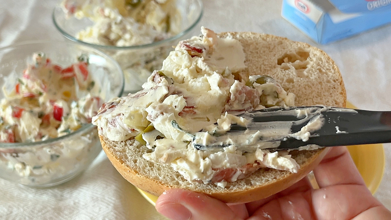 이 크림치즈는 2인분 기준으로 만들었지만 사실 양이 좀 넉넉한 2인분이다. 그래서 난 먹고 남은 크림치즈를 열탕 소독한 용기에 넣어 보관했다. 하지만 하루가 지나자 파프리카 크림치즈에 물이 고인 모습을 볼 수 있었다. 그러니 최대한 남는 양이 없도록 먹을 만큼만 만들고, 최대한 빨리 먹는 것이 좋겠다.