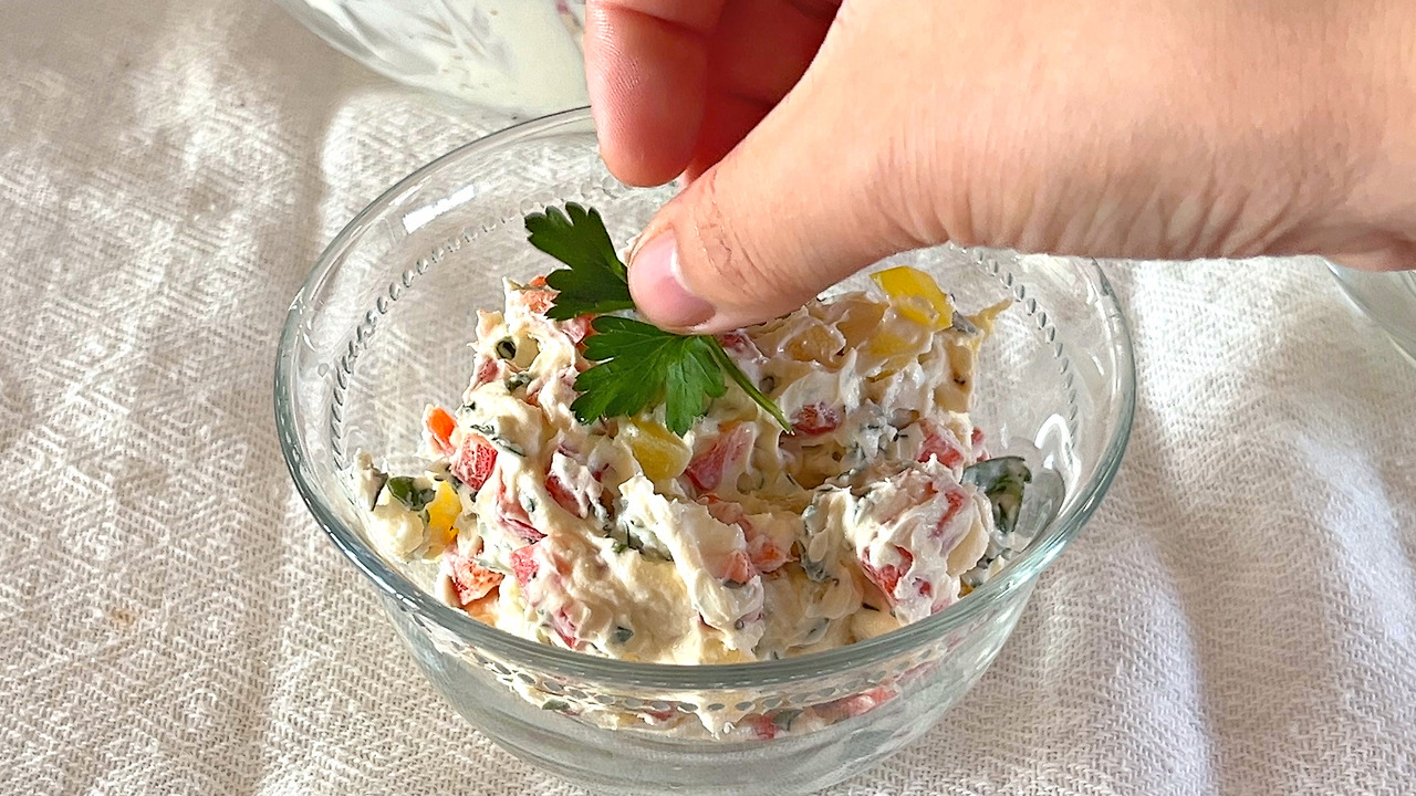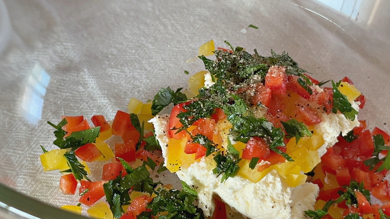 4. 다른 보울에는 크림치즈 110g, 파프리카, 파슬리, 설탕, 후추를 넣어 섞어준다.