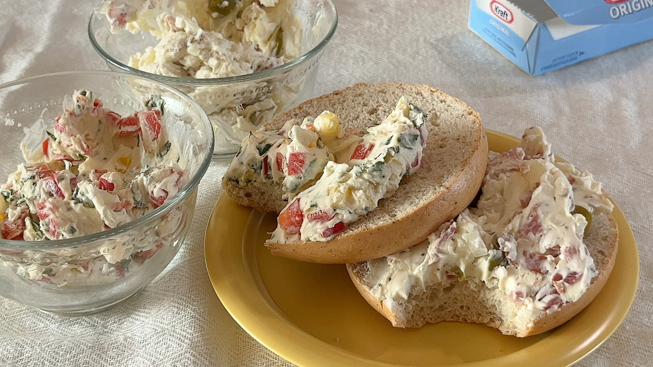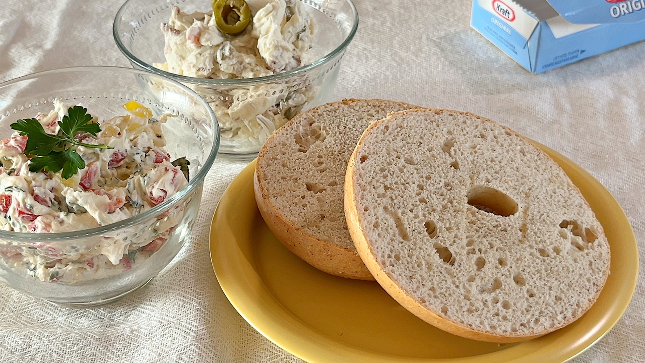 크림치즈 220g, 다진 파슬리 1큰술, 빨강 파프리카 1/3개, 노랑 파프리카 1/3개, 베이컨 2줄, 올리브 5개, 양파 1//4개, 후추 약간, 꿀 1큰술, 설탕 1/2작은술, 베이글 1개
