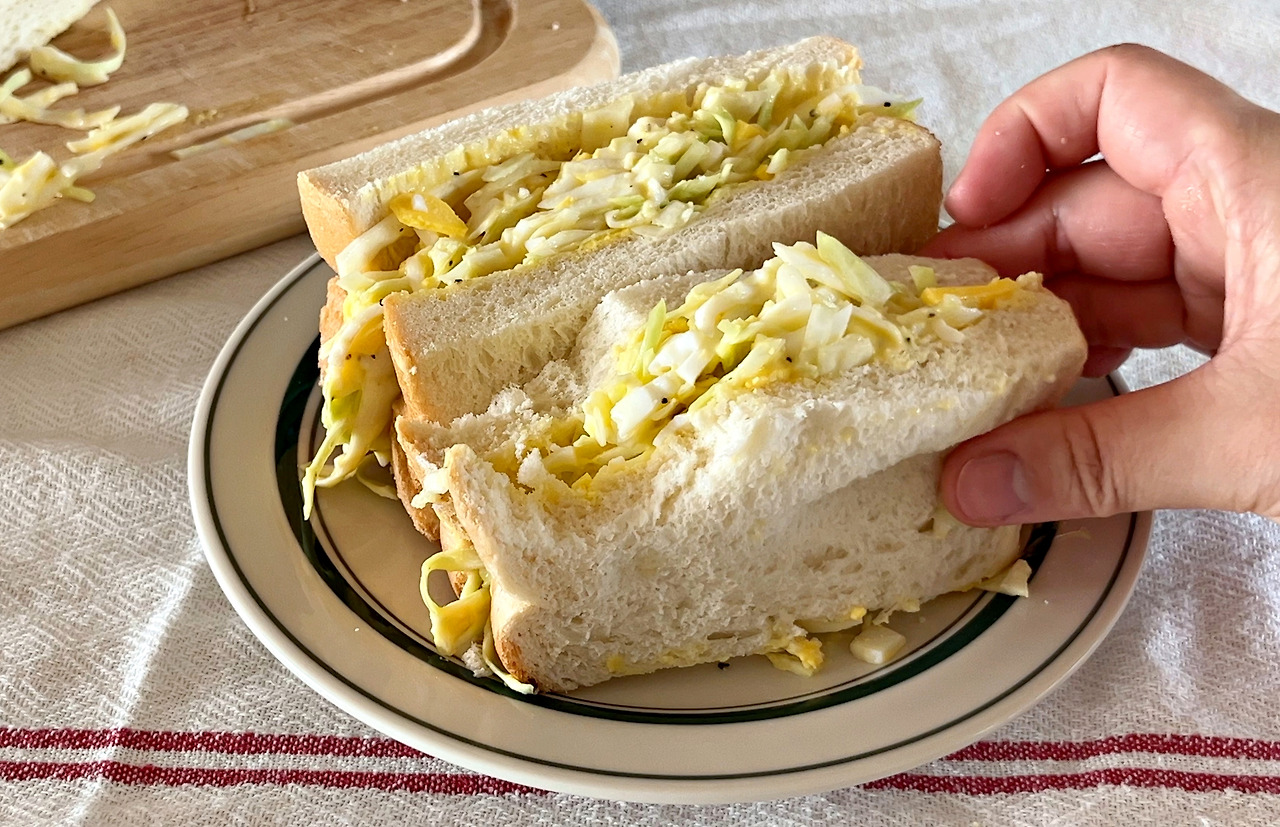 식빵은 구워도 좋고, 굽지 않고 사용해도 좋다. 하지만 양배추의 아삭한 식감을 더욱 즐기고 싶어 식빵은 부드러운 상태로 두었다. 바삭한 식빵을 거쳐서 나오는 양배추보다 부드러운 식빵을 지나고 난 뒤에 느껴지는 양배추의 식감이 훨씬 아삭하겠지?