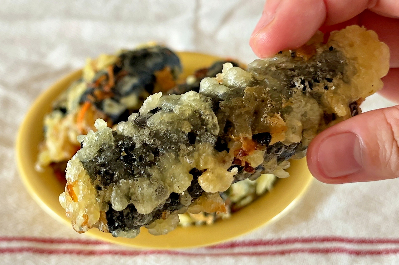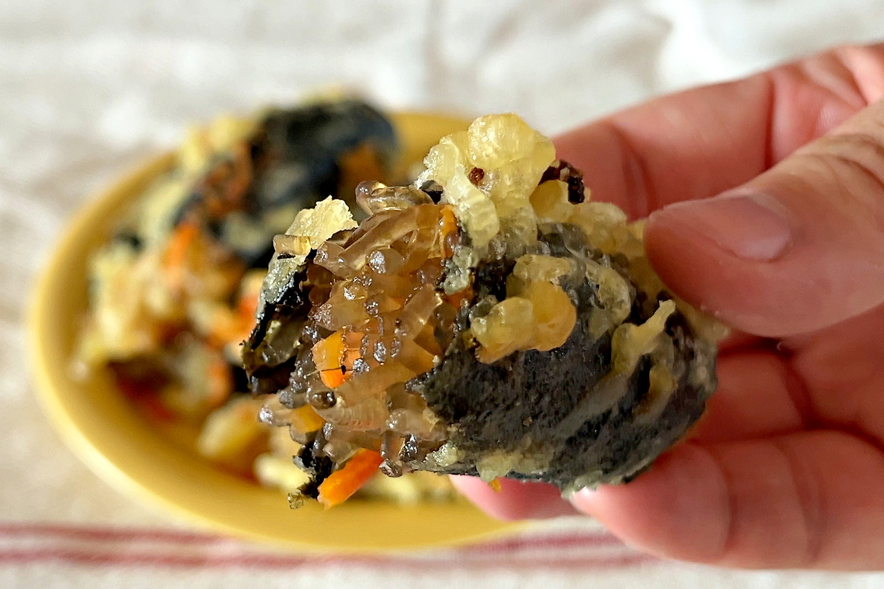 당면 100g, 김 3장, 당근 1/3개, 간장 1큰술, 설탕 1작은술, 후추 약간, 튀김가루 250g, 물 400ml, 식용유