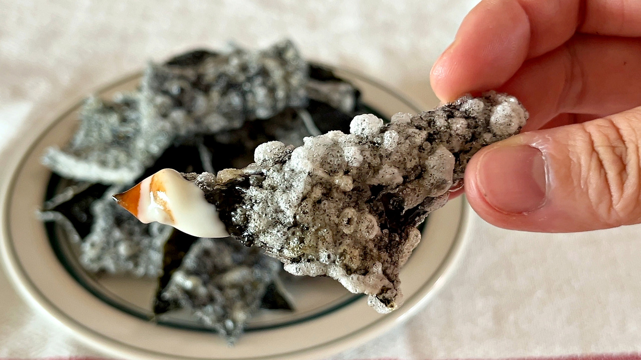 라이스페이퍼 김부각을 만들 때 가장 중요한 단계가 바로 이 단계이다. 여기서 김의 물기를 최대한 말려주어야 한다. 물기가 조금이라도 남아있으면 기름에 넣어 튀겨도 바삭하지 않고, 질긴 식감만 남게 된다. 만약 전자레인지를 사용하기 힘든 환경이라면 바람이 잘 통하는 곳에 두어 몇 시간 동안 충분히 말리고, 전자레인지를 사용할 수 있다면 10초 간격으로 김이 잘 말랐는지 확인해가며 돌려주자.