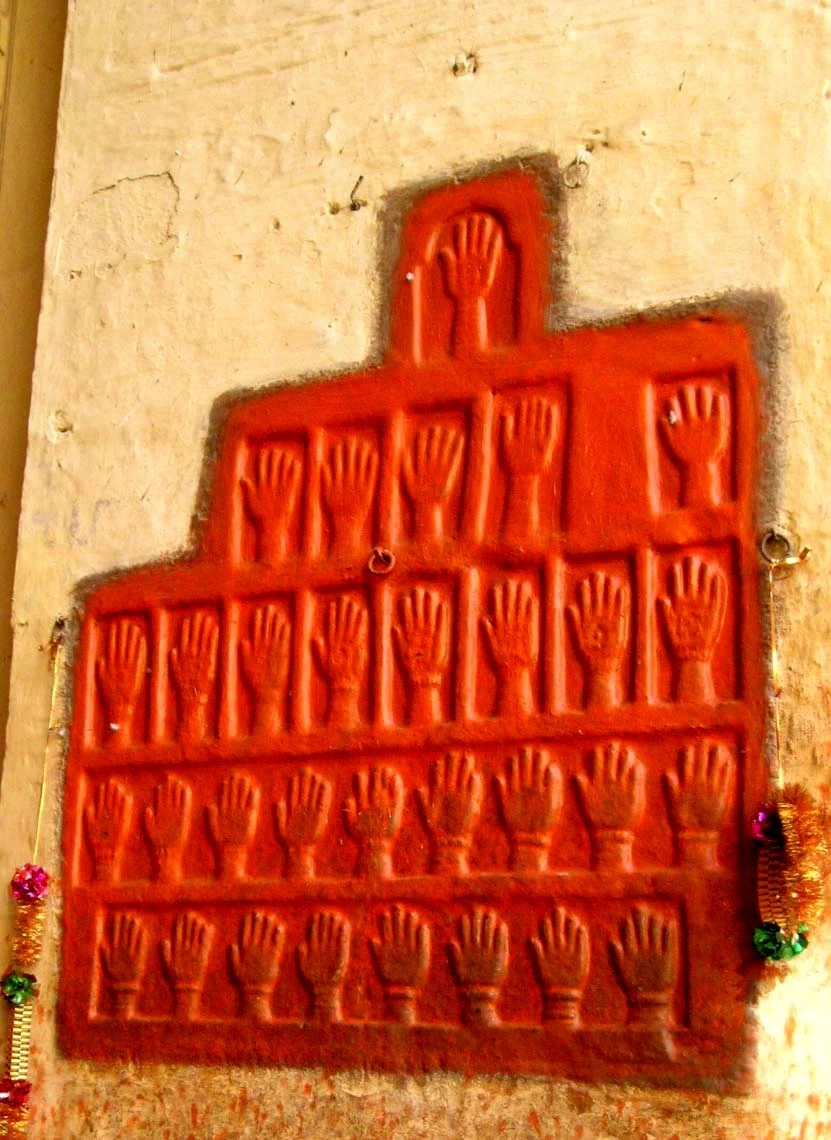 성에 들어가는 입구 마하라자 만싱 부인의 ‘사티(Sati: 붉은 손바닥 자국으로 죽은 남편을 따라 불속으로 뛰어드는 풍습을 상징함)’를 볼 수 있다. 이 붉은 손바닥 자국은 남편이 사망하면 과부는 손을 붉은색으로 물들여 문에다 손자국을 남기고 살아있는 채로 장례식 중 남편의 시체와 결합시켜 함께 화영이 되었다고 한다. 화려한 결혼식 옷을 입고 있는 여인과 남편의 시체는 천상에서 두 사람의 결합이 이루어져 하나가 된다고 믿는다. 과부 여인은 사랑이라는 명목상 아름답게 화영에 처해진다고 하지만 과연 사랑이며 아름답다 이름 붙일 수 있는 의식인 걸까.