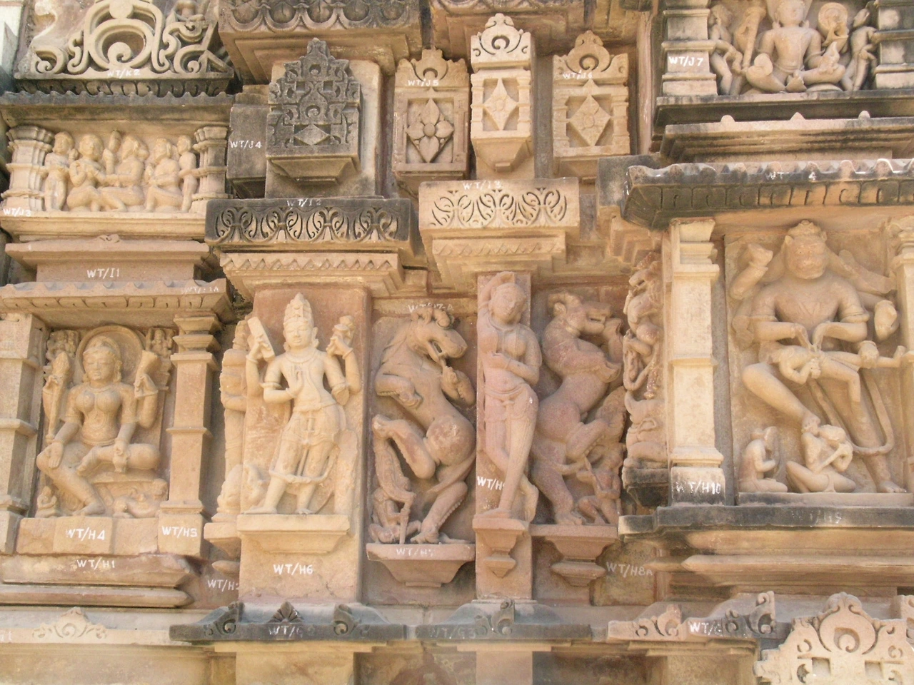 이 카주라호의 힌두 사원들은 남쪽에 있는 차투르부즈(Chaturbhuja)를 제외한 모든 사원이 일출을 바라보고 있는 것이 특징이며, 남성적 신과 여성적 신의 통합과 상호의존성을 강조하는 작품들이 많다. 대부분 복잡한 조각상들이 많은데 이는 *다르마, 카마, 아르타, 막샤를 상징하는 작품들이 다수이며 왕성한 에로티시즘을 보여주는 조각품들이 10% 미만을 차지하고 있다.