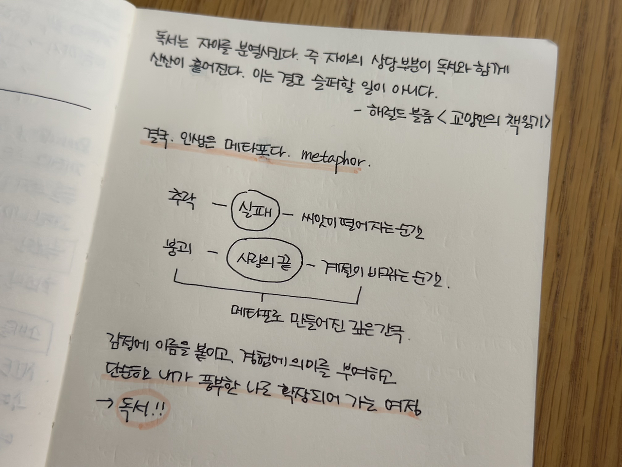 사실 우리의 삶은 물리적 경험만으로 이해되기 어렵다. 슬픔, 실패, 상실 같은 감정들은 구체적 언어로 옮겨져야만 이해된다. 책은 그 언어를 제공한다. 같은 실패라도, 어떤 이는 그것을 '추락'이라 부르고, 어떤 이는 '씨앗이 떨어지는 순간'이라 부른다. 뜨거웠던 사랑의 종말도 누군가에겐 '붕괴'이고, 누군가에겐 '계절이 바뀌는 순간'일 수 있다. 그 차이를 만드는 것이 바로 독서에서 얻은 비유의 언어, 메타포적 사고다.