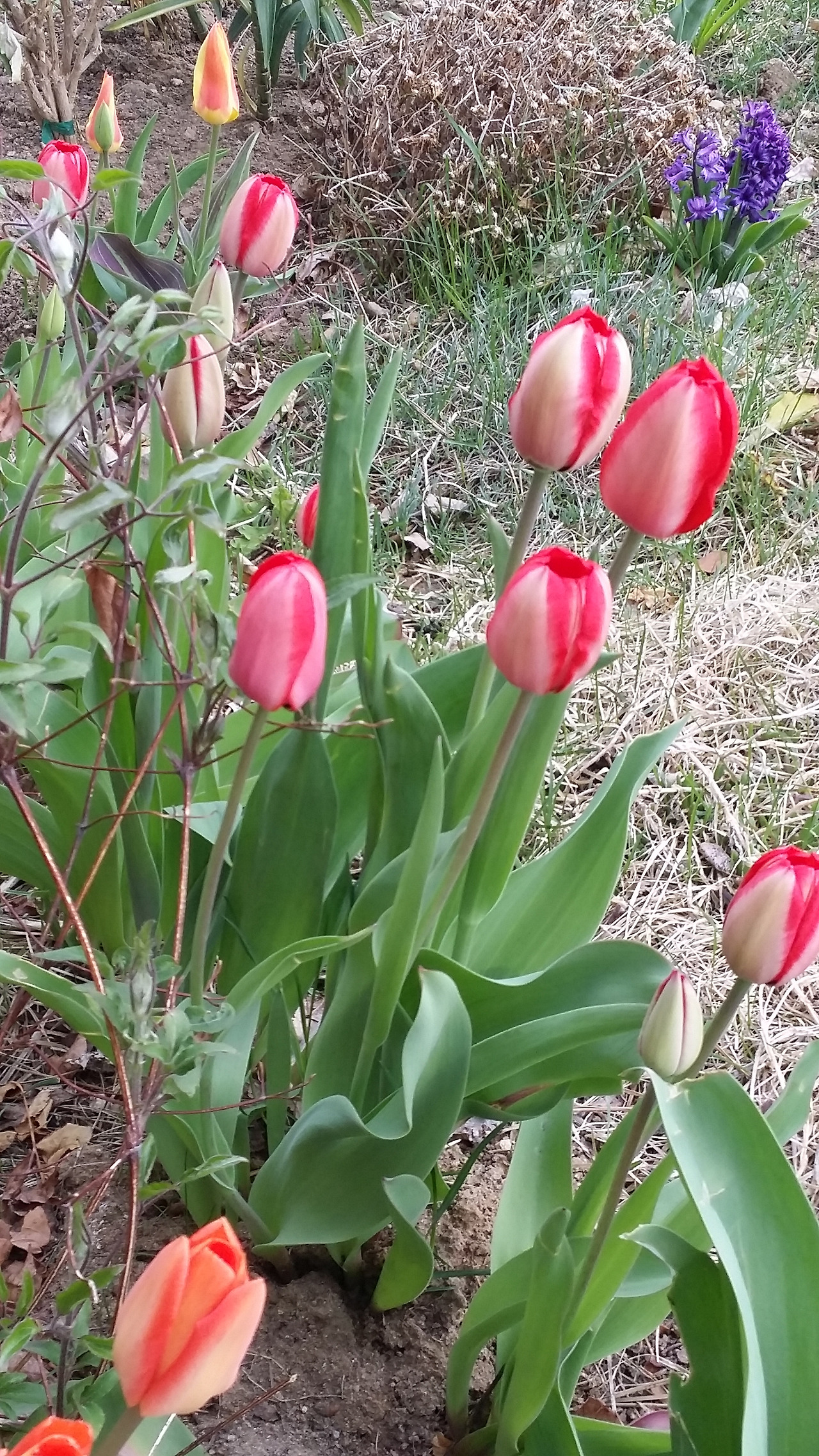 이제 피기 시작한 현관 잎 튤립들에게