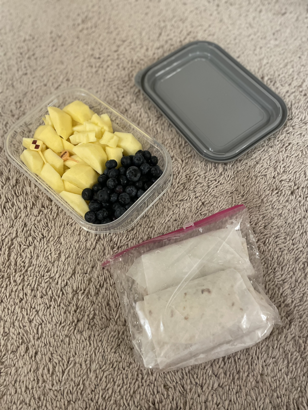 집에서 사과와 블루베리를 도시락 통에 담아 갔다.