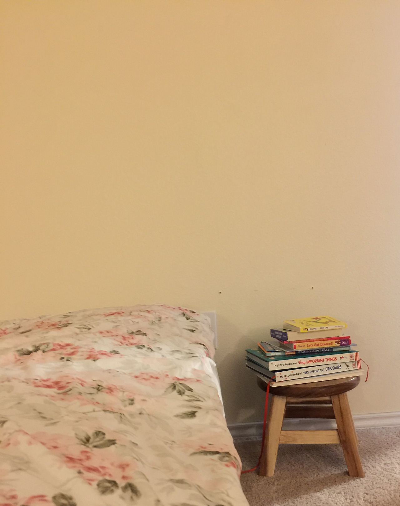 이 둘 중 이동이 편하고 사려던 북스탠드처럼 자리를 많이 차지하지 않는 물건이 무엇일지 2차 검증에 돌입했다. 미니 책장은 적어도 책 20권은 넣을 수 있는 크기여서 침실로 옮기면 짐이 늘어날 가능성이 있었다. 반면, 아이들 스툴 의자는 작고 아담해 책 3~4권을 놔두기에 안성맞춤이요 카펫 청소를 할 때는 손으로 쉽게 들어 움직일 수 있기에 북스탠드를 구매했을 때와 가장 비슷한 효과를 보여줄 가구는 바로 아이들이 쓰던 원목 의자!였다.