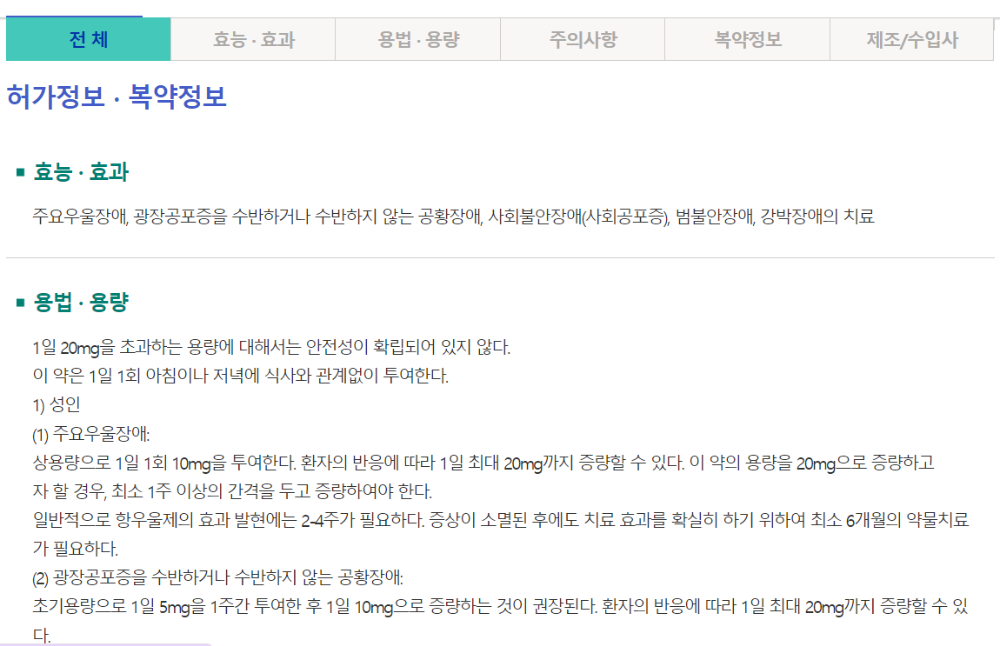 식약처에 공식적으로 등록된 약에 관한 정보들이 나와 있다. 한 가지 유의할 부분은, 이 정보가 가장 기본이긴 하지만 여기에 나와 있지 않은 증상, 용량, 용법으로도 너무나 다양하게 사용하고 있다는 점이다(이걸 off-lable 로 사용했다고 한다).