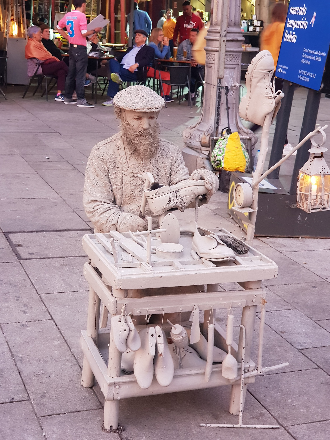 나는 문득 일어나 걷기 시작했다. 한 어린아이가 아빠의 손을 잡고 무언가를 골똘히 바라보고 있다. 아빠는 아이 쪽으로 허리를 숙이고 놀라운 눈빛을 하며 연신 무언가를 아이에게 속삭인다. 내 시선도 그 부자(父子)의 시선에 맞추어졌다. 거기엔 회반죽을 덮어 쓴 듯한 동상이 있었다. 아까 전에도 보았었다. 의자에 앉아 구두를 수선하는 할아버지 동상이었다. 한참 전에는 왼쪽을 향해 있었는데, 이번에는 강변을 향해 앉아 있다. 설마.... 저 동상이 사람이었어? 거리의 많은 행위 예술가를 보아오긴 했지만, 이번만큼은 믿을 수가 없었다. 왜냐하면...눈을 깜빡이지 않기 때문이었다. 나는 그가 정말로 사람인지를 살펴보기 위해 그의 등 뒤에 섰다. 숨을 쉬는지 알고 싶었다. 거의 느낄 수가 없었다. 숨조차 느낄 수 없을 만큼 움직임이 없었다. 그의 얼굴 쪽으로 다가가 눈을 뚫어지게 바라보았다. 역시나 눈은 조금도 깜빡이지 않았다. 그런데 누군가가 동전 몇 닢을 함에 넣고 간다. 갑자기 그의 오른팔이 힘차게 움직이더니 구두에 망치질을 하는 것이었다. 탕! 탕! 탕! “오 마이 갓!” 내 입에서 절로 튀어나온 말이다. 늦은 오후에 등장한 그는 몇 시간이고 그 자리에 그렇게 앉아 있었다. 하염없이. 눈을 깜빡이지도, 시선을 움직이지도 않은 채. 몸 전체를 석고로 뜬 사람처럼. 그 남자는 아무것도 하고 있지 않았다.