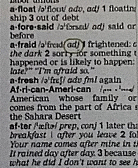 late을 확인해 보면 ‘늦은’ ‘늦게’ 등으로 되어 있음을 알 수 있어요. 영어에 좀 익숙한 편이라면 단어에 ~ing나 ~ed를 붙여보세요. 그 모양이 익숙하다면 그 단어는 ‘동사’예요. 하지만 영 이상하다면 그 단어는 ‘동사’가 아닐 확률이 크지요. 그럼 확인해 볼까요? afraid는 동사일까요, 아닐까요? ~ing를 붙여보니 어떤가요? 낯이 익은가요? 영 이상하죠? 그 느낌이 맞는 거랍니다. Afraid는 동사가 아니에요.