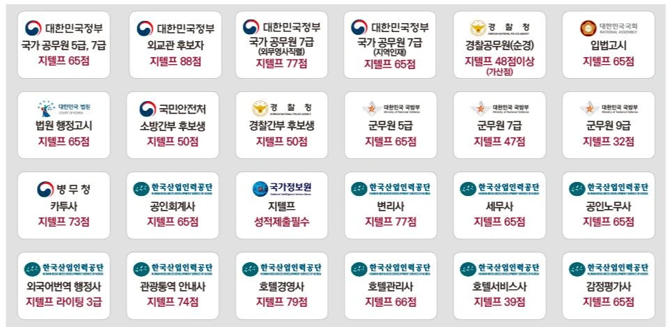 현재 국내에서 지텔프가 가장 많이 활용되는 영역은 공무원 7급을 포함하여 다양한 국가기관, 공사, 공기업 채용 분야입니다. 외교관 후보생, 5급 공채, 입법고시, 군무원, 국가정보원 채용 외에도 세무사, 노무사, 변리사, 카투사 선발에도 활용됩니다. 이 외에도 관광통역안내사나 호텔관리사와 같은 자격 취득에도 활용되며 [위 이미지 참고], 여러 대기업 채용이나 대학교의 신입생 선발에도 활용됩니다.