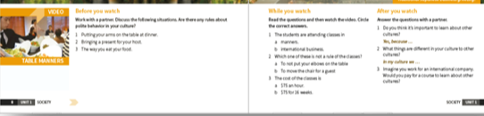 인포그래픽스를 이용하여 주제에 대해 관심을 환기하고 가볍게 이야기를 나눈 뒤, 두 번째 활동으로 비디오 동영상(Video)과 관련 활동(Activities)이 이어집니다. 동영상은 대개 3분 정도로, 동영상을 보기 전(Before you watch)에는 간단히 등장 어휘를 미리 살펴보고, 동영상을 보는 중에는(While you watch) 내용을 이해/확인하고, 동영상을 본 뒤에는(After you watch) 내용에 관련하여 의견을 간단히 말해보도록 하는 내용/활동이 함께 제시됩니다.