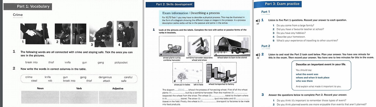Get Ready for IELTS 시리즈의 각 Unit 은 주제에 관련된 어휘를 익히는 Part 1, 해당 스킬을 연습하는 Part 2, 실제 시험 유형에 맞춰 공부한 사항을 적용해 보는 Part 3, 이렇게 3단계로 구성되어 있습니다. 단계적으로 차근차근 접근해 나가는 일관적인 방식은 공부하는 학생에게도, 가르치는 선생님에게도 매우 명확하면서도 설득력 있게 다가옵니다.