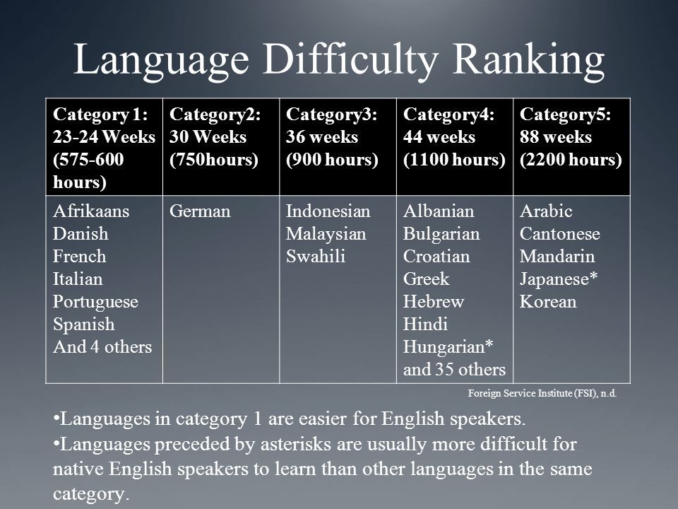 미국 국무부에 따르면, 영어를 모국어로 하는 사람이 중국어를 배우려면 최소 2,200 시간의 학습시간이 필요하고 이 중 절반은 실제로 중국어를 사용하는 국가에서 보내어져야 합니다. (위 표의 category 5) 반면에 같은 수준의 스페인어를 배우는 데에는 600에서 750시간의 학습이 소요됩니다. (위 표의 category 1)
