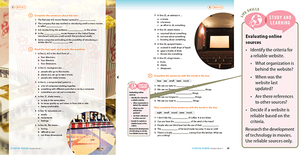 Essential Reading 개정판은 4권에서 3권으로의 축소라는 외형적 변화 외에도 초판의 다소 아쉬웠던 편집상의 마무리 등에도 개선이 있었습니다. 전체적인 구성에 큰 변화가 있지는 않으나, Life Skill이라고 하는 제목의 작은 Tip 이 Unit 마다 하나씩 추가되었습니다. Macmillan 출판사는 사회생활이나 학습, 직업 등 일종의 '생활의 지혜'라 할 수 있는 실생활과 연결되는 콘텐츠를 강조하고 있는데요, Essential Reading 에도 그 특징을 반영하였다 할 수 있습니다. 예를 들어, 2권의 Unit 4 Movies 에는 온라인의 정보들을 판단하는 기준에 대해 간단히 알려 주고 있지요. 더불어 이런 기준에 맞춰 Unit 주제인 영화와 관련된 사이트를 찾아서 판단해 보라는 실습(?)도 제안합니다. 시간이나 기타 여건만 허락한다면 수업에서도 유익하게 활용할 수 있는 Activity가 될 수 있습니다. (아래 이미지 참고)