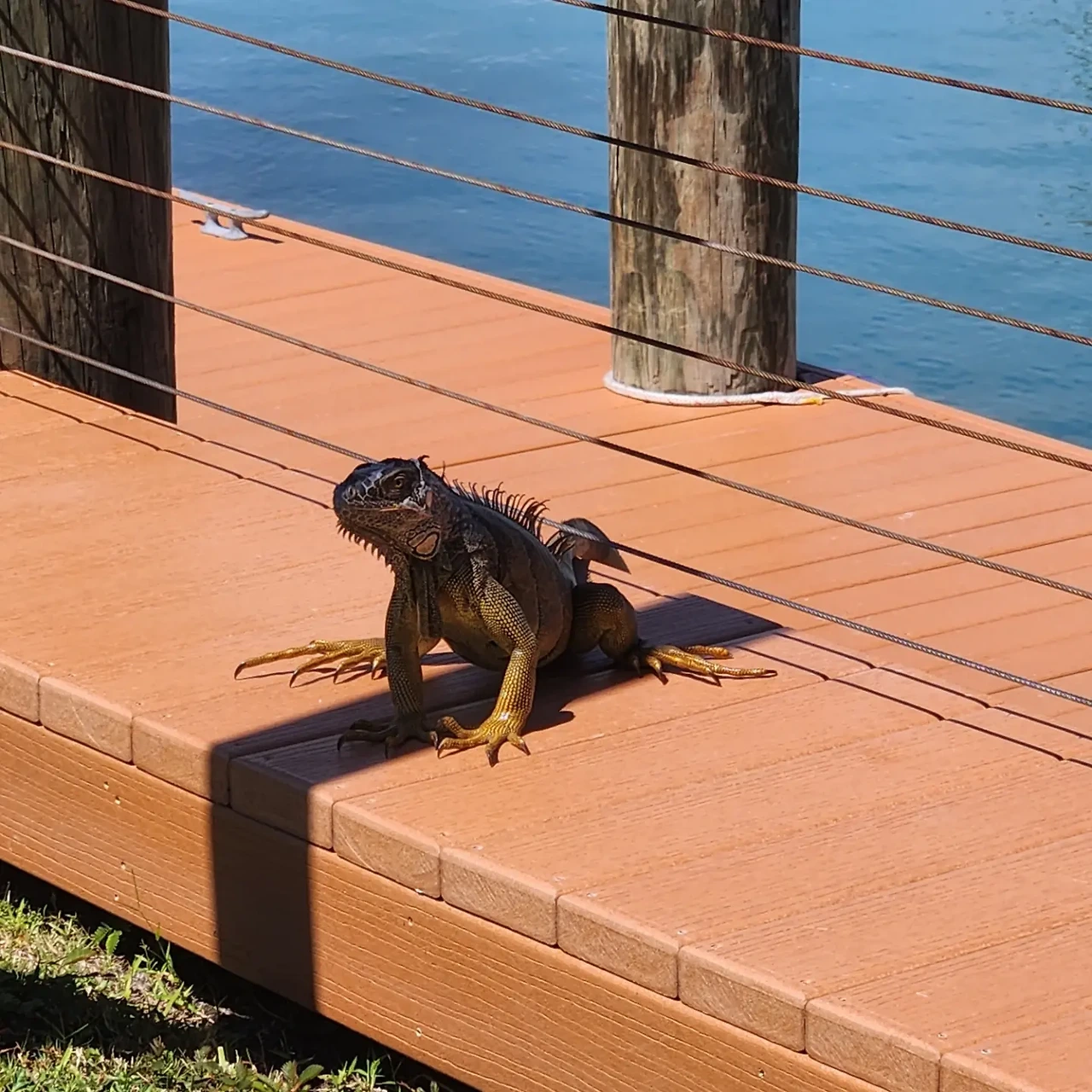 뜨끈한 나무 데크 위, 햇빛을 등지고 누워 있던 이구아나 한 마리.