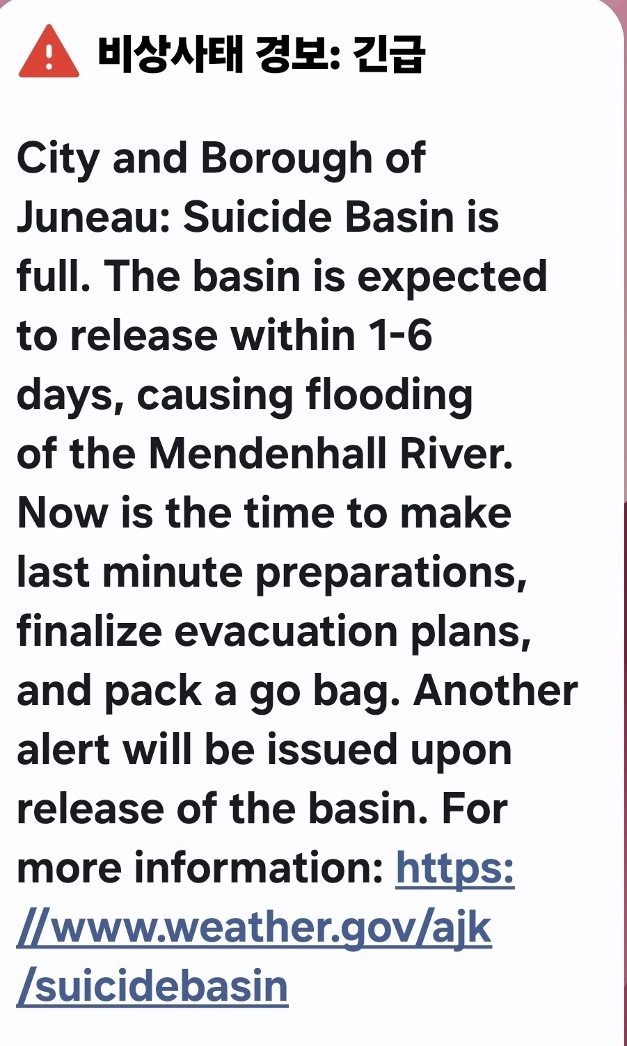 주노 전역에 **홍수 경보**가 울렸다.