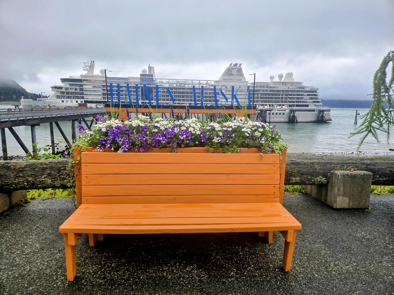 헤인스 선착장, 뒤로 보이는 설산과 마을. 헤인스 항구 앞, 알록달록한 벤치와 꽃