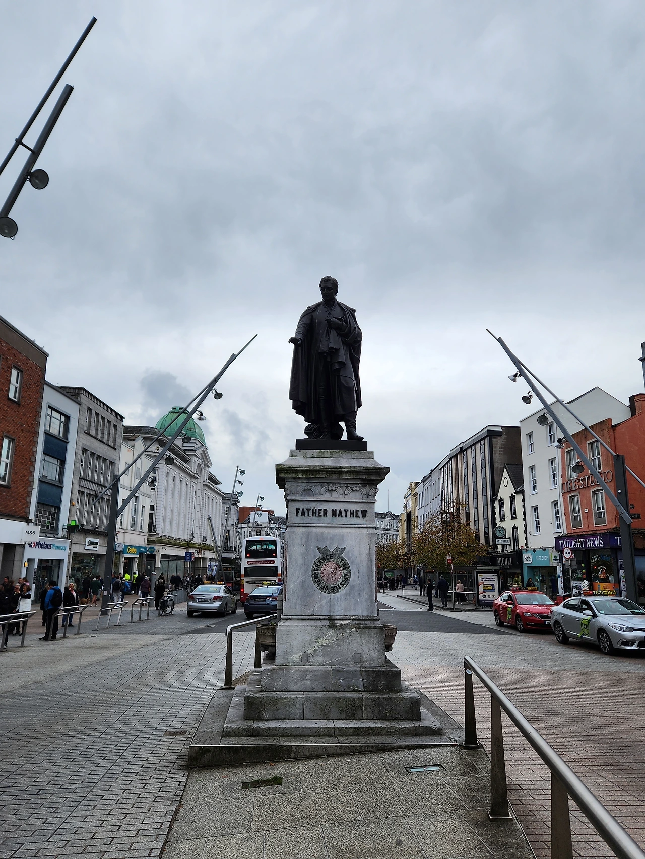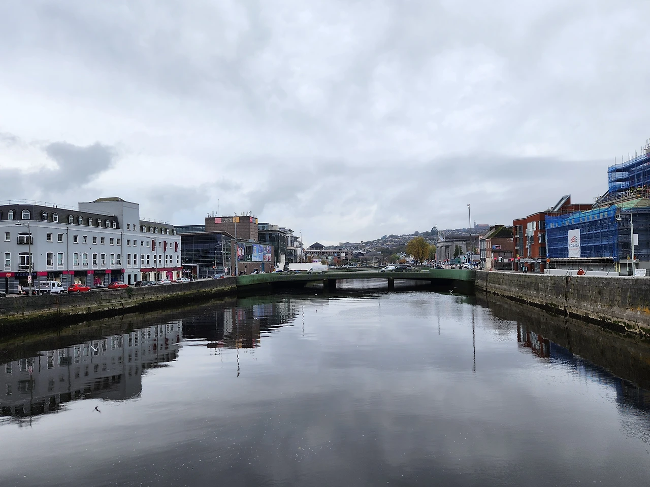 코크 시내 중심가 동상 거리 리 강 위에 비친 회색 하늘