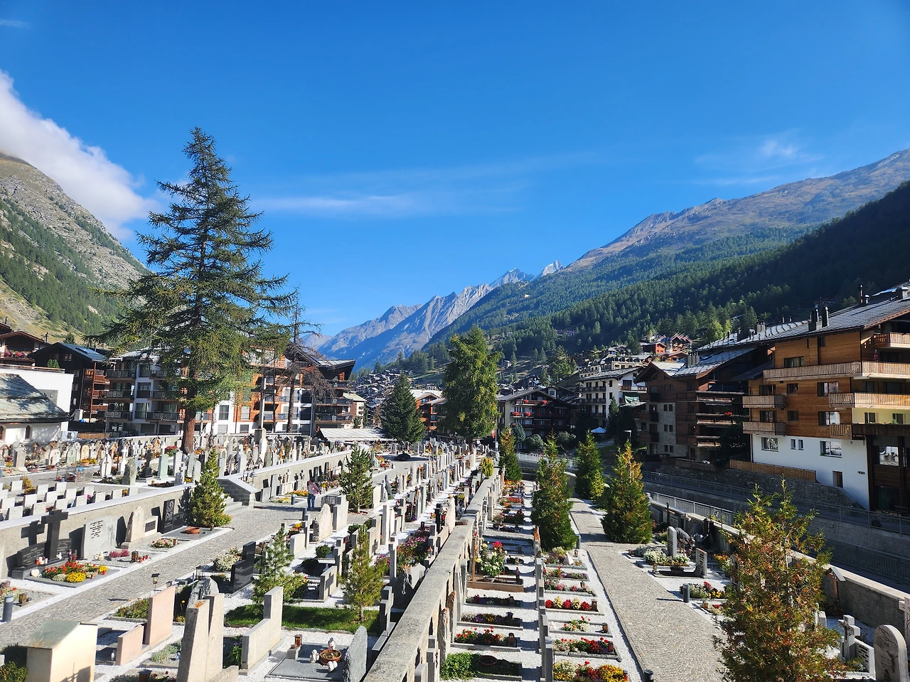 체르마트에서 본 마테호른 설산. 체르마트 공동묘지에서 내려다본 산맥. 체르마트 메인 거리