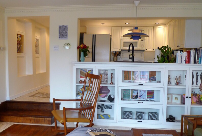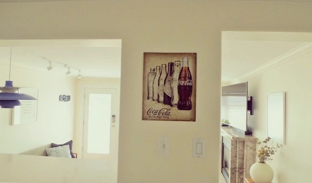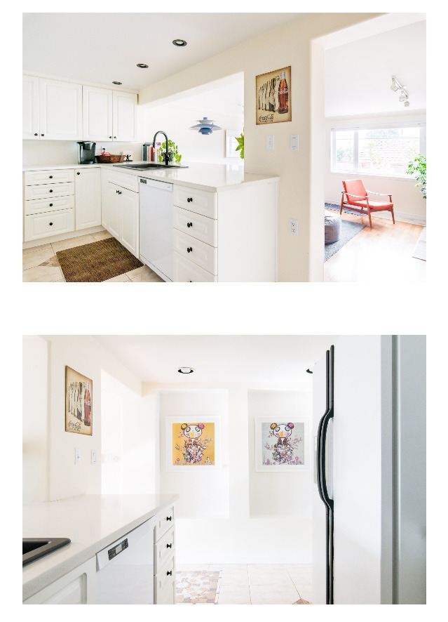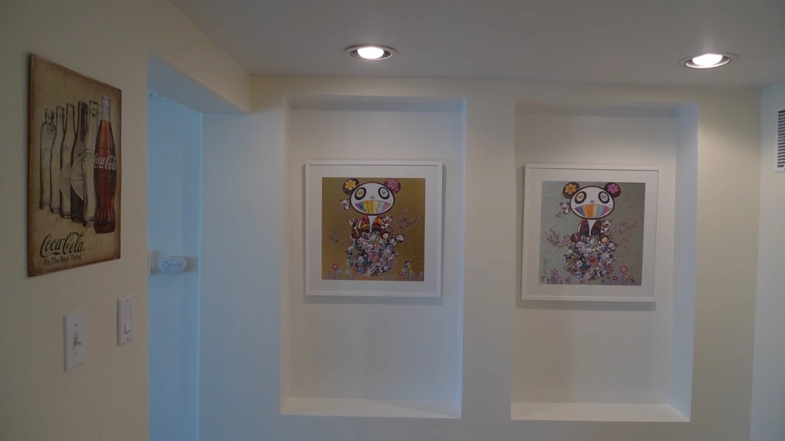 예전 주인이 그림을 좋아했는지 부엌 앞 벽에는 조명까지 갖추어진 작품을 걸 수 있는 공간이 만들어져 있었다. 나란한 공간에 같은 이미지지만 금색과 은색으로 다르게 표현된 무라카미 타카시 작가의 귀여운 판다 판화들을 걸어서 공간을 살리면서 통일성을 주었고 빅토리아 아일랜드 여행에서 구입한 콜라 광고 소품을 팝아트 작품처럼 부엌 벽에 걸어 재미를 주었다.
